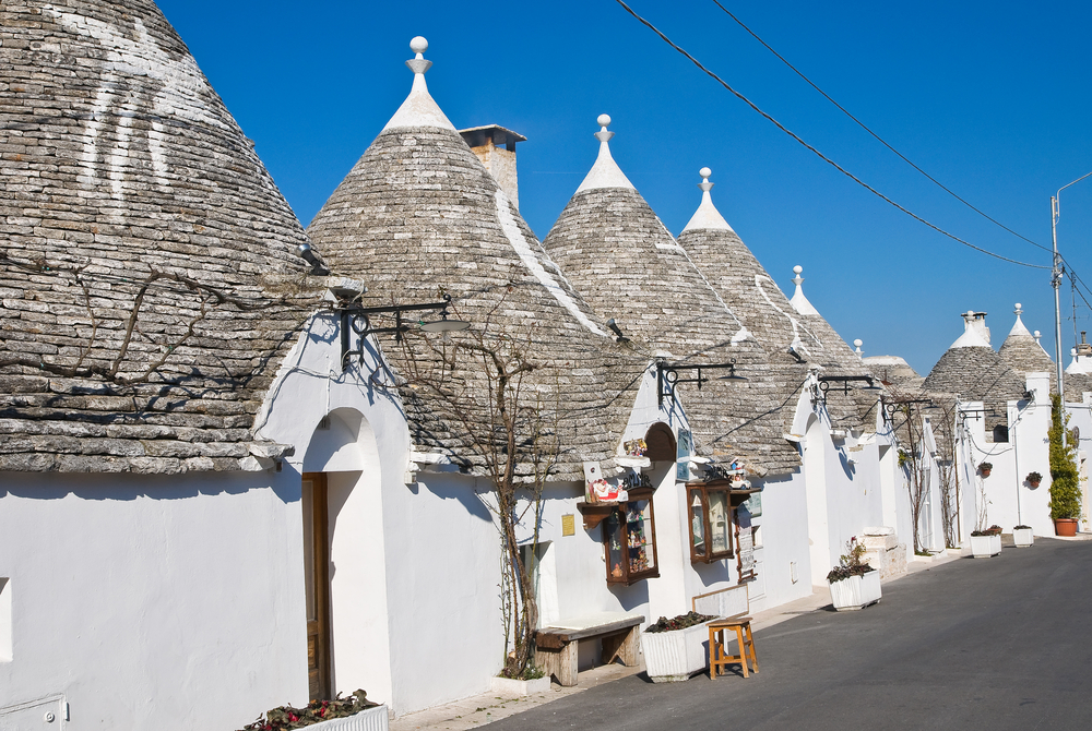 I trulli sono delle costruzioni che servivano sia come abitazioni che come riapri momentanei. Tutt’oggi sono costruiti con l’antica tecnica della pietra a secco. Il loro colore chiaro è dato dalla pietra calcarea imbiancata. La struttura è singolare perché su una base rettangolare è costruito un tetto conico. Sulla punta del cono che forma il tetto c’è sempre un piannacolo che serve a scacciare le influenze negative o la sfortuna. Inoltre, su molti tetti sono disegnati dei simboli con la cenere bianca: sono prevalentemente simboli pagani legati a figure animali. Ognuno ha un suo significato, ad esempio il cane rappresenta la famiglia, il gallo la vigilanza e il bue scongiura le sciagure.